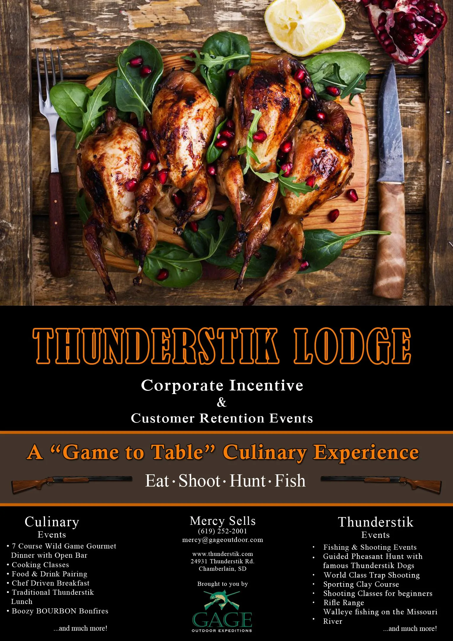 Our Corporate “Game to Table” packages include team building, team wild game cooking lesson, hunting and/or fishing, adventure outings, shooting, access rifle and skeet ranges, gourmet breakfasts, lunches and dinners featuring wild game. The historical Thunderstik Lodge facilities include our main lodge and two single story ranch homes that combined comfortably accommodating 28 single occupancy guests or 56 double occupancy guests. Come and experience the breathtaking view of the Missouri River from Thunderstik’s front porch after an exciting day of South Dakota hunting and fishing! Scan the rolling hills down to the river as you try to spot our local buffalo heard, mule deer and other native wildlife.