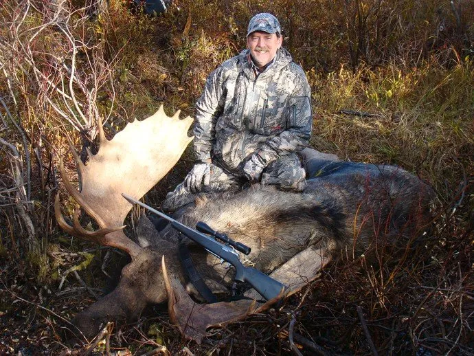 2011 Moose Hunting Results (9 for 9) 100% MANITOBA MONSTER MOOSE……….AGAIN! A fantastic week of hunting saw a huge 57″bull taken by Larry Maybe with a .50 Cal Muzzleloader from under 50 yards shooting a 250 grain bullet one shot was all that was need from this distance. Larry bragged to Rick about the punch this gun had and while at our target range Larry blasted a 1/2″hole in a 3/8″ plate of steel……..from 150 yards!
