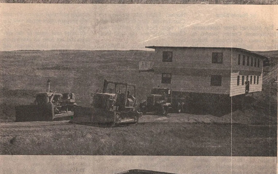 Construction of the new lodge began in early 1988, with the arrival of its first two buildings. An early newsletter tells the story: “In mid-July, an unusual caravan drove into Chamberlain; one carrying a one-room school house built in 1904 and the other a arge steel building weighing over 50 tons, which was originally constructed some 90 miles away to house construction workers building a new dam at Pickstown, South Dakota.”