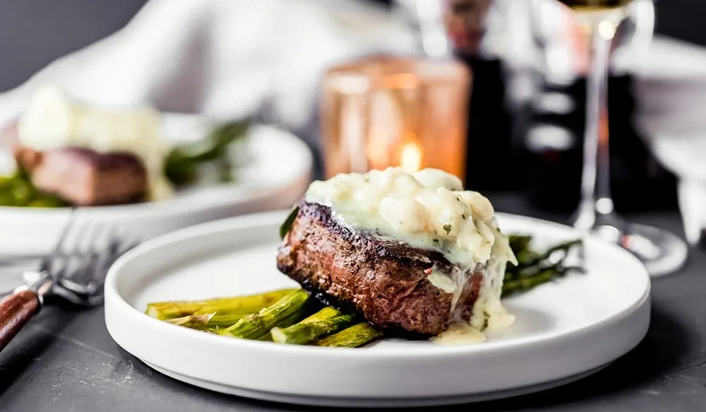 - To plate and serve, place half the asparagus spears on each plate, then top with the bison filet mignon. Then top with the crab béarnaise sauce and serve immediately.